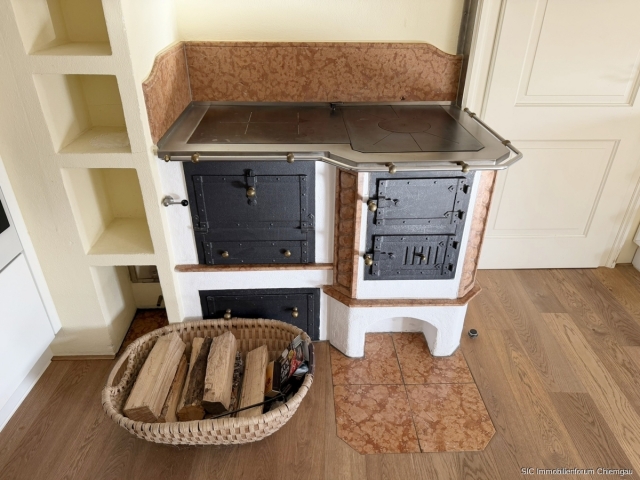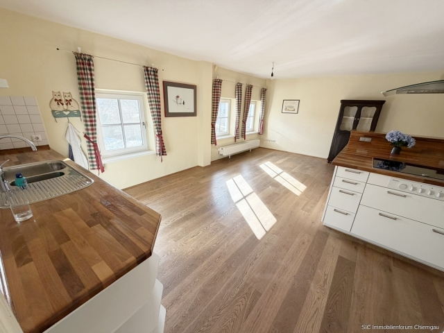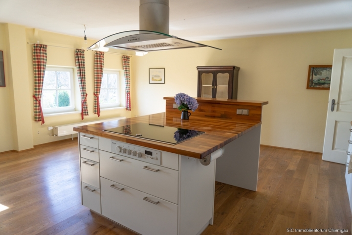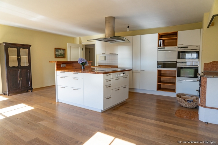 Über eine Treppe gelangt man in das Obergeschoss, das sich durch einen sehr großen, offenen Flur auszeichnet. Auf der Südseite befindet sich hier ein gemütlicher Sitzbereich mit etwas Bergblick. Von diesem Flur aus betritt man die sehr geräumige Küche, die mit zwei Küchenzeilen, einer Kochinsel sowie einem zusätzlichen holzbefeuerten Küchenherd ausgestattet ist. Mehrere Fenster zur Südseite sorgen für eine angenehme Belichtung und es ist ausreichend Platz für einen großen Esstisch vorhanden.